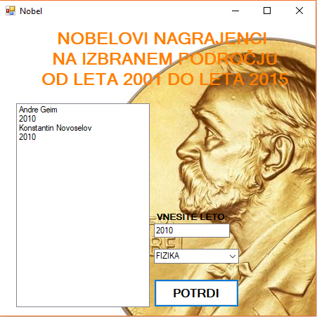 - Sestavi čim lepši grafični uporabniški vmesnik, s katerim pregleduješ bazo NOBEL. Izhajamo iz "konzolnega" programa, ki je objavljen.