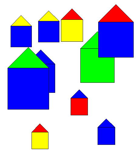 7. Sestavi funkcijo, ki nariše več različnih hiš. Število hiš naj bo določeno s parametrom, vse ostalo (položaj hiše, velikost hiše, obe barvi) pa izbiraj naključno.