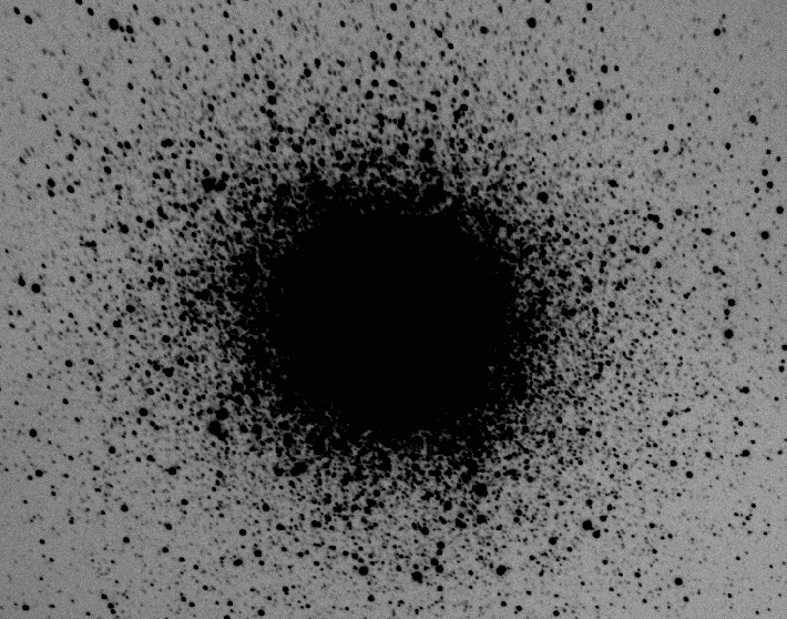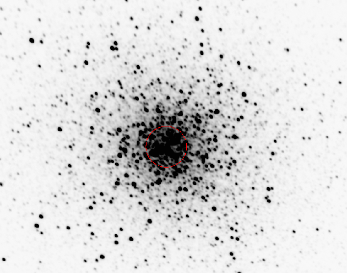 Na tako prikazani sliki se bolje vidi center kopice. Najprej moram natančno določiti center kopice. To se naredi z metodo centroid, to je izračuna se težišče (fluksa) kopice. Za začetne koordinate kopice, da ne ugibam preveč, uporabim kar kataloško vrednost recimo iz Simbada, ali pa dam, da mi kar iraf poišče: