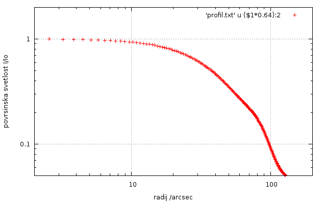 Rezultat, tabeliran profil radij/intenziteta dobim v datoteki sM13_W.prf.1 in še narišemo v gnuplotu, izberem log-log graf: