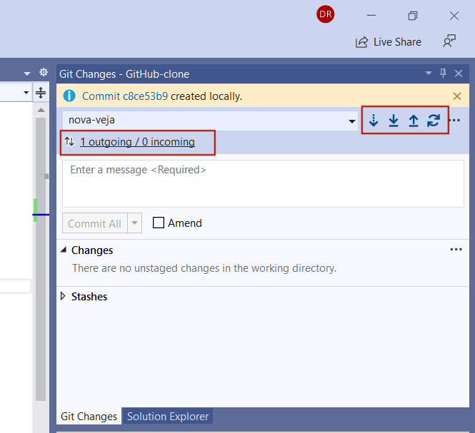 Z ukazom **commit** potrdimo spremembe, ki smo jih ustvarili v kodi. Dobra praksa programiranja je, da ta ukaz izvedemo za vsako konkretnejšo spremembo v kodi in pri tem napišemo ustrezen komentar. S commit-anjem se tudi izognemo zmedi glede vejitve. V Visual Studiu se namreč vse necommitane nove datoteke vidijo v naši glavni veji, česar vsekakor ne želimo!