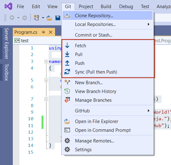 Povezava na Github preko Visual Studia je zelo enostavna, saj nam program že sam ponuja to možnost. Obstaja tudi razširitev oziroma paket GitHub Extension for Visual Studio, ki si ga lahko naložimo.